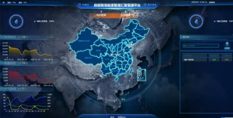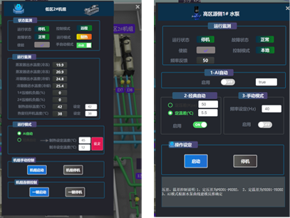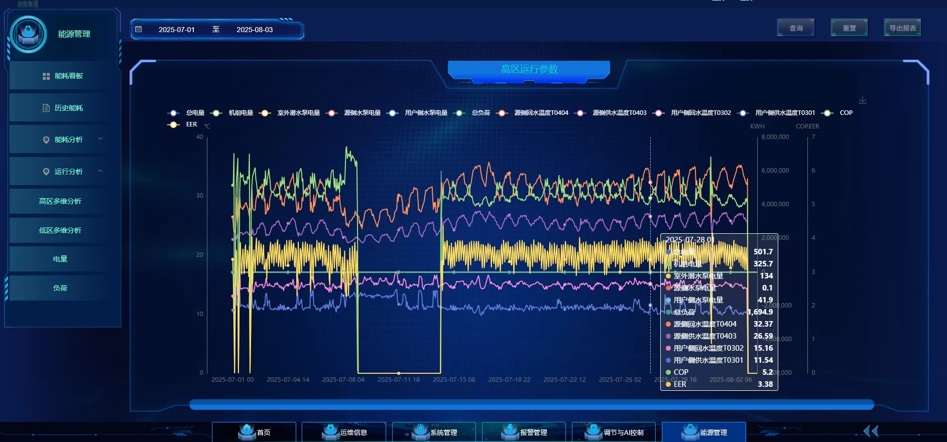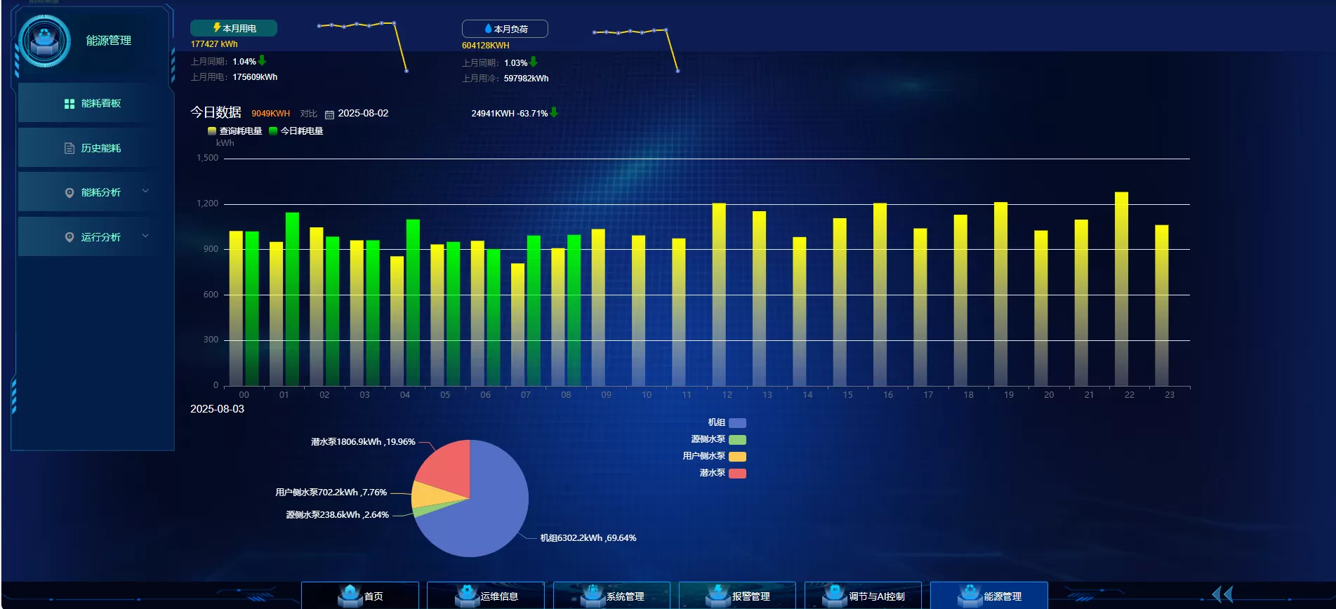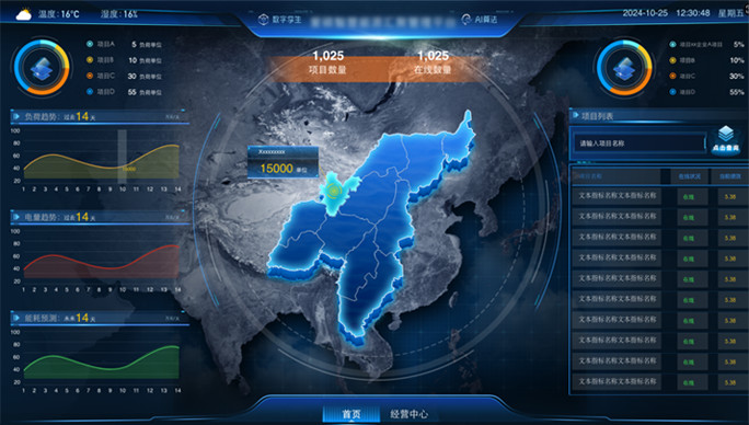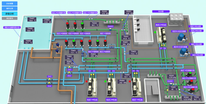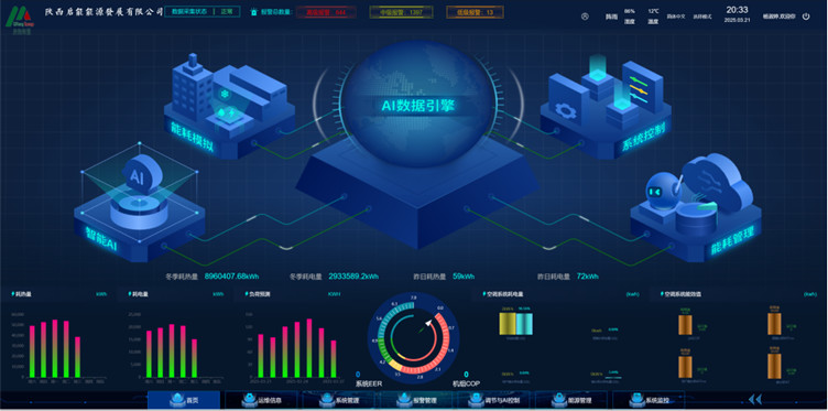 项目耗电、耗热、负荷预测、各设备系统能耗、运行效率、告警、天气等关键数据展示;